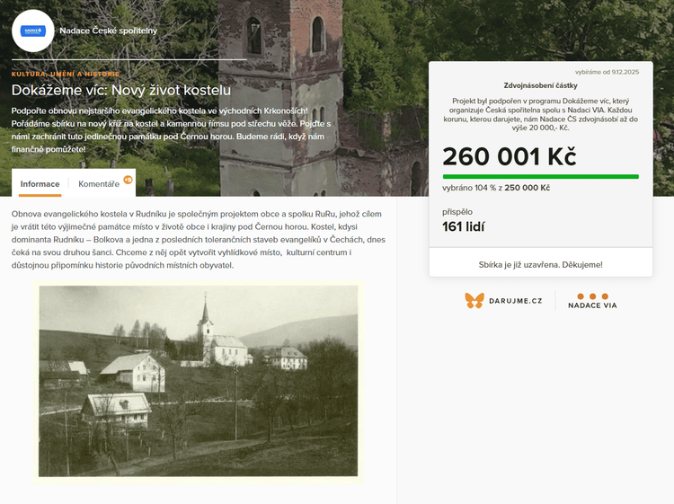 Takto úspěšná sbírka je jasným důkazem zájmu o záchranu a budoucnost této výjimečné památky. Díky vám všem dostává významná památka Rudníku nový symbol i nový život. Ještě jednou srdečně děkujeme! ❤️